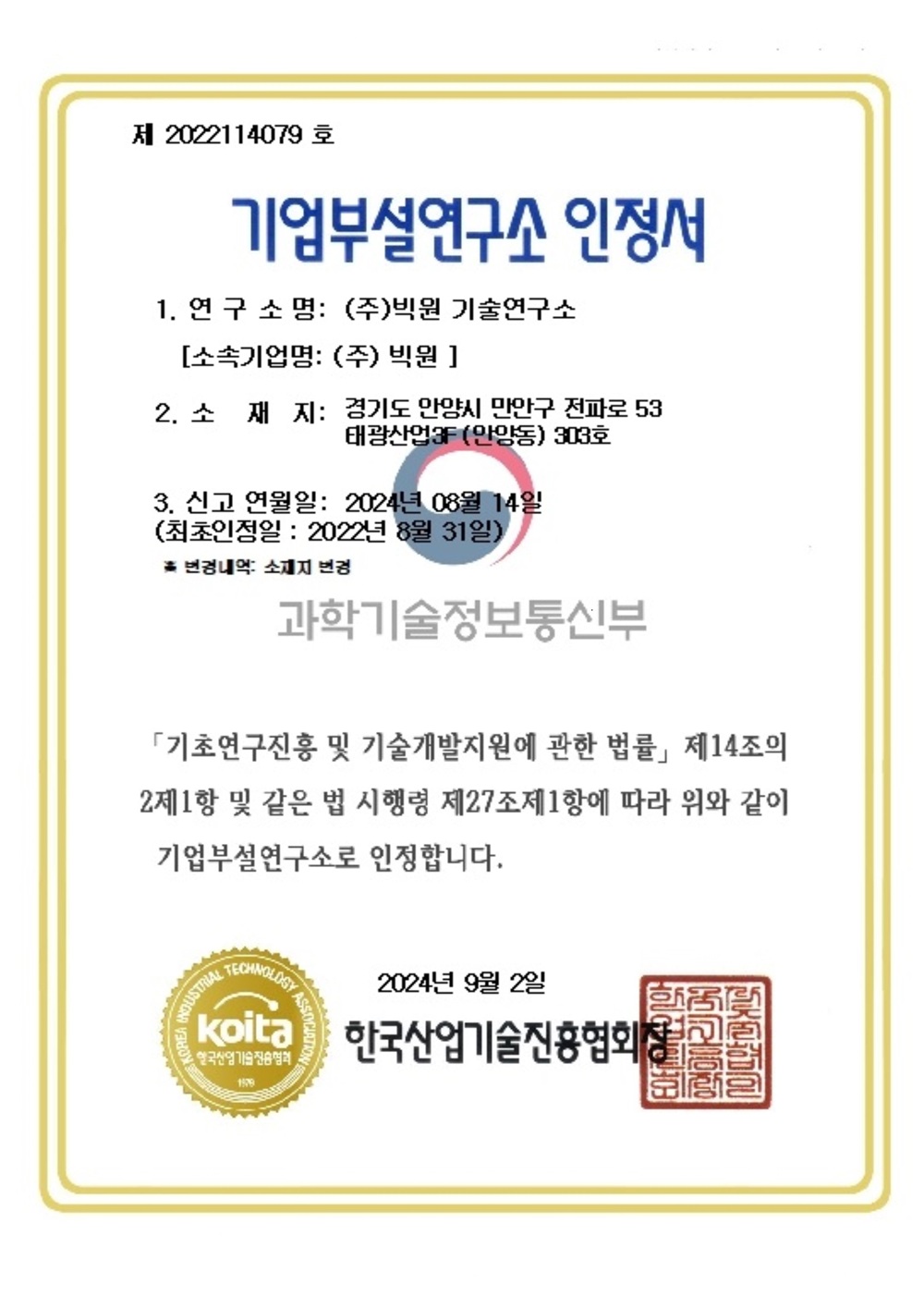 당사는 ISO 9001 품질경영시스템 인증을 획득하여 국제 표준에 기반한 체계적인 품질관리 시스템을 운영하고 있습니다.